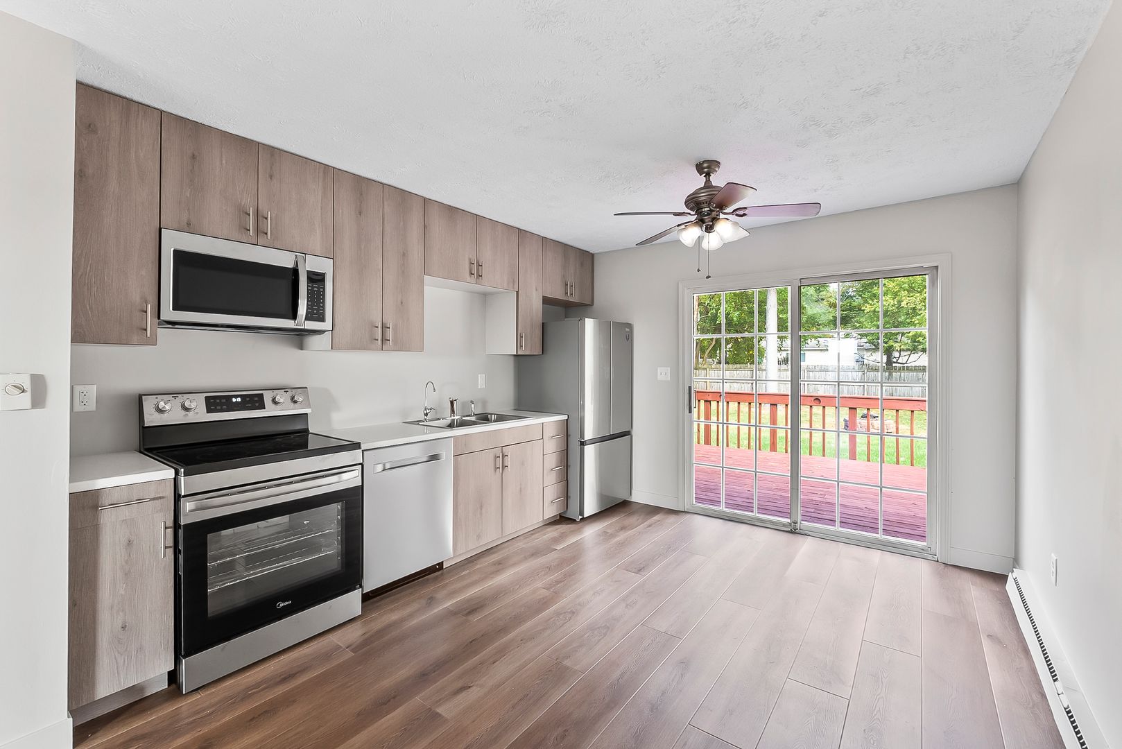 Enjoy new LVP flooring across the home, a brand-new kitchen, and a fully updated bathroom. The kitchen features stainless steel appliances, including a refrigerator, dishwasher, stove, and microwave, while the bathroom offers a new tub-shower combo and updated vanity. Ceiling fans are installed throughout for added comfort.